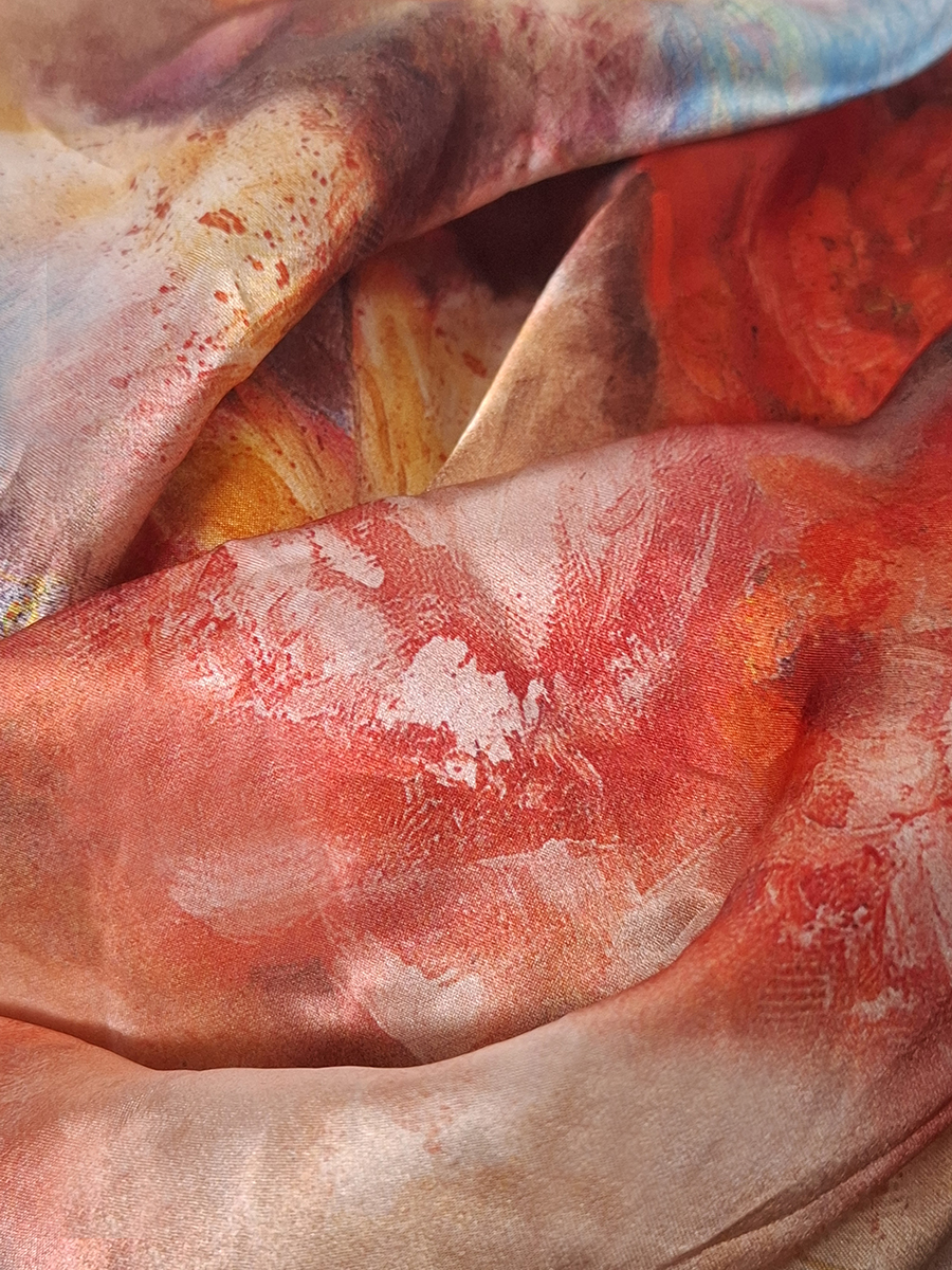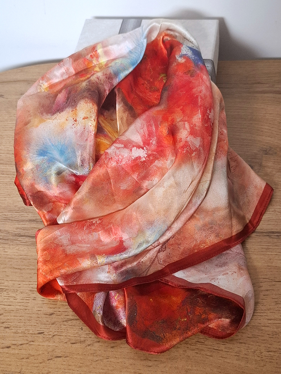 Naturalny jedwab jest tkaniną wyjątkowo delikatną, lekką i oddychającą. Pozwala skórze zachować komfort termiczny, nie podrażnia i miękko dopasowuje się do ciała. Jego subtelny połysk i płynność sprawiają, że apaszka układa się naturalnie i elegancko.