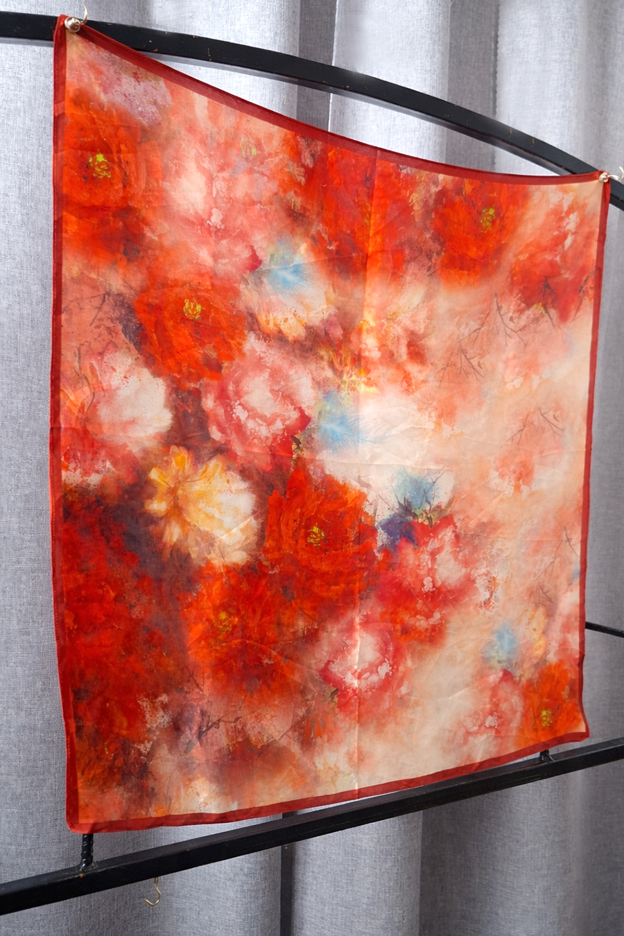 Kolorystyka oparta jest na ciepłych odcieniach czerwieni, przełamanych miękkim kremem i subtelną nutą błękitu. Rozmyty, kwiatowy wzór nadaje całości lekkości i malarskiego charakteru, tworząc spokojną, kobiecą kompozycję.