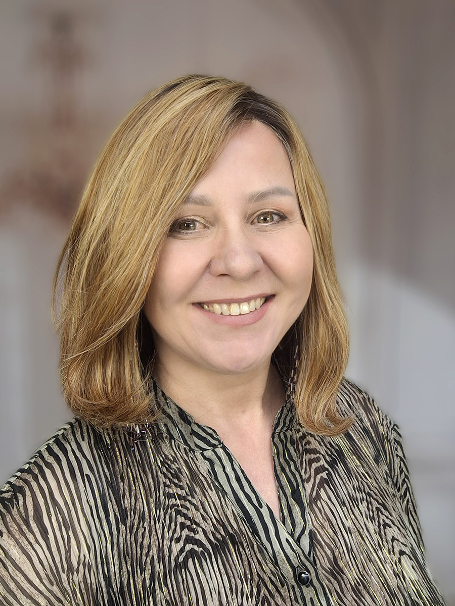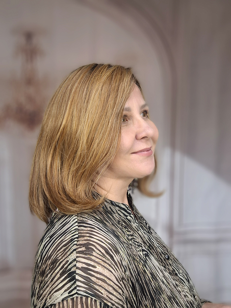 Peruka Olga to model fryzury o klasycznym cięciu long bob bez grzywki. Końcówki włosów są wymodelowane pod spód, grzywka łagodnie obrysowuje twarz. Włosy zaczesane asymetrycznie na prawą stronę są długości wystarczającej do zaczesania ich za ucho.