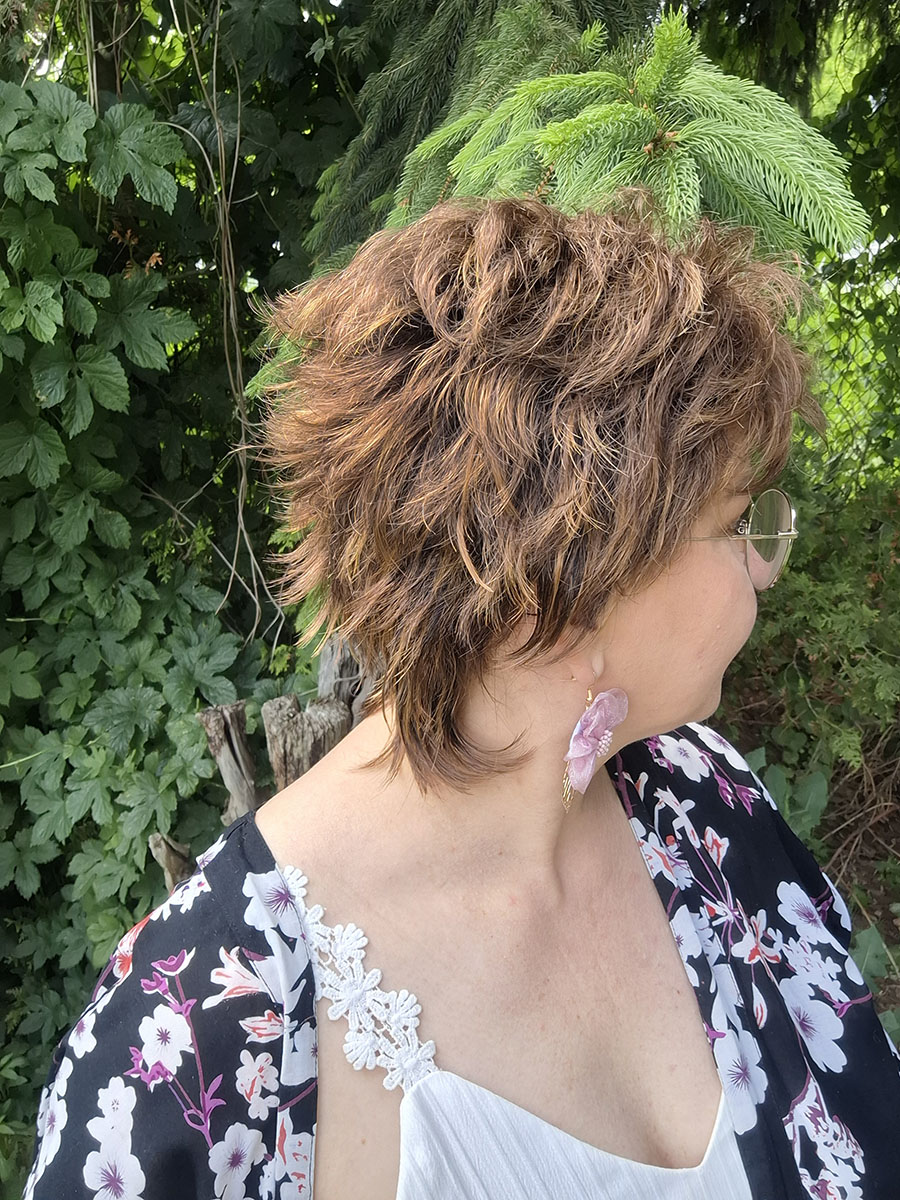 Fryzura pocieniowana i wystrzępiona na całej długości. Na czubku głowy włosy są krótkie, dlatego w łatwy sposób utrzymują się uniesione do góry. Na grzywce są nieco dłuższe, przykrywające czoło.