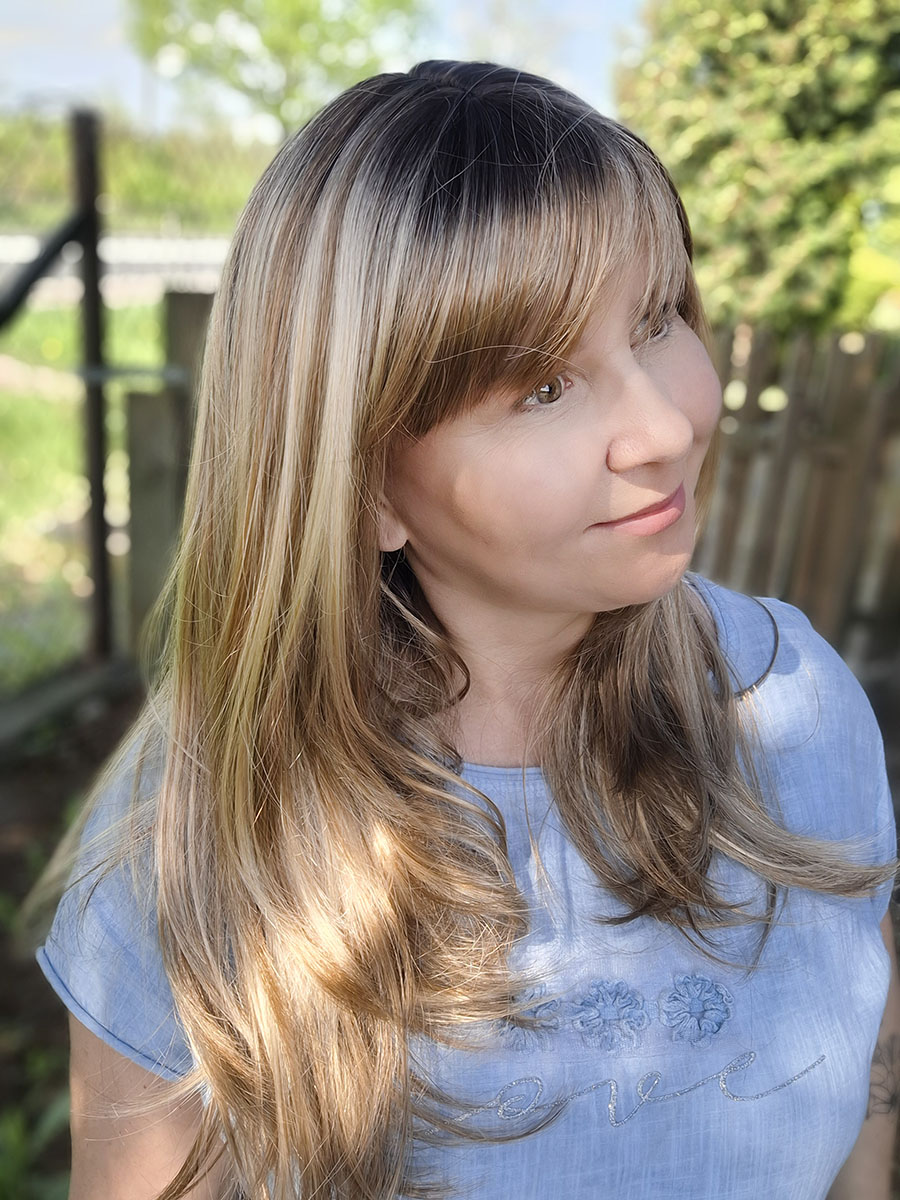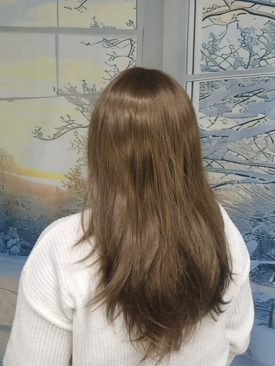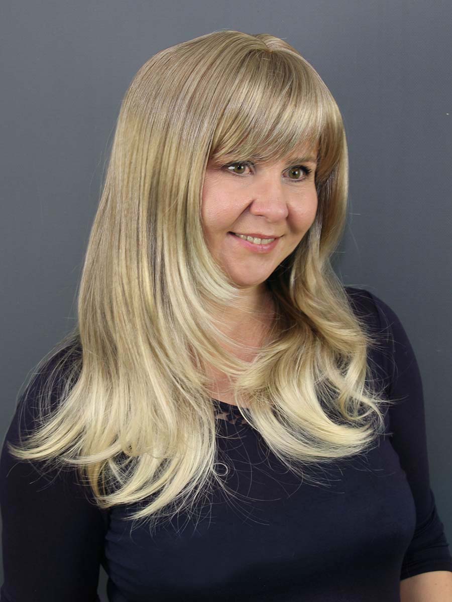 Peruka wykonana z włosów syntetycznych nietermicznych – kanekalonu. Włos gładki, miły w dotyku o delikatnym połysku.