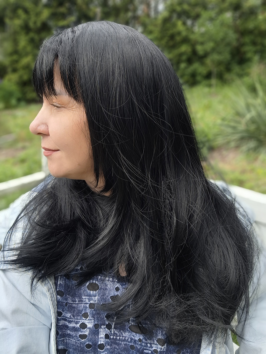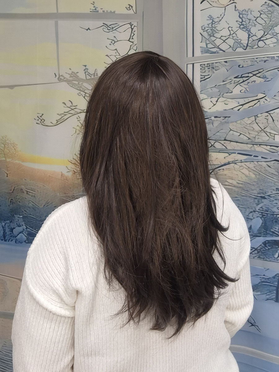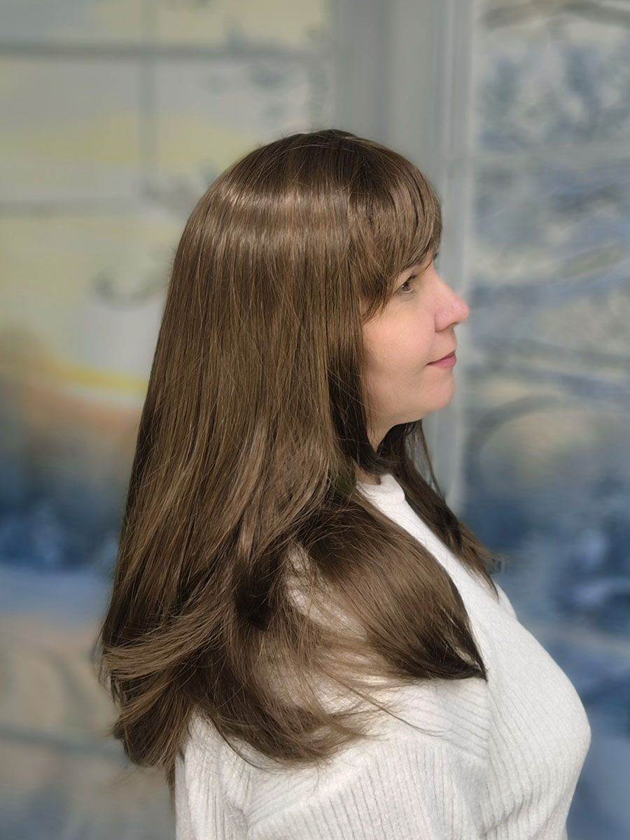 Peruka wykonana z włosów syntetycznych nietermicznych – kanekalonu. Włos gładki, miły w dotyku o delikatnym połysku.