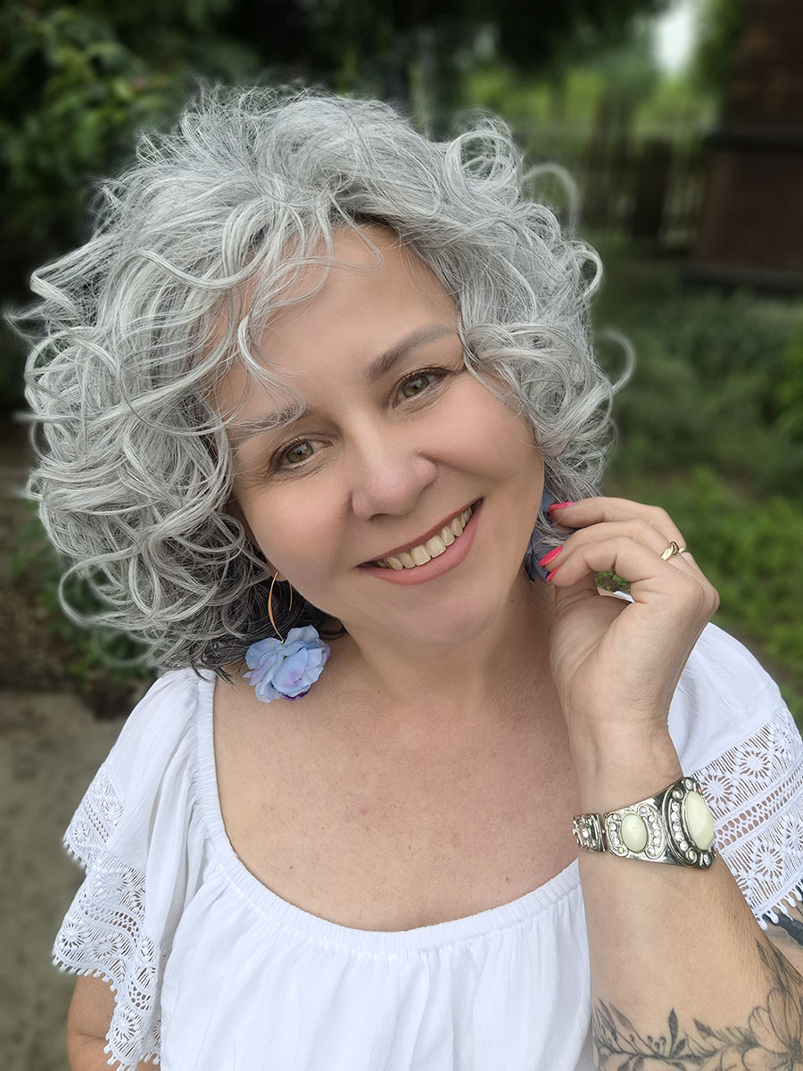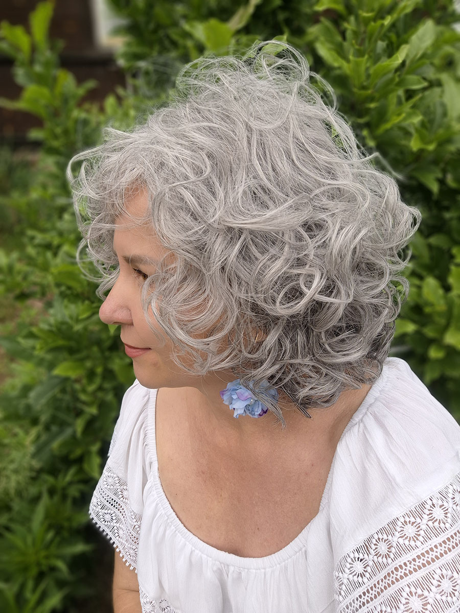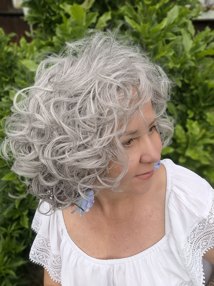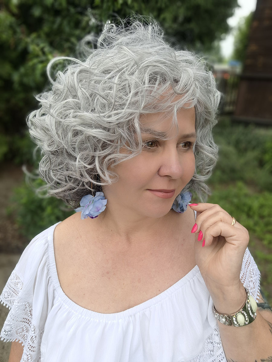 Model został wykonany z włosów syntetycznych termicznych Future, odpornych na wysoką temperaturę, które doskonale imitują naturalne włosy i pozwalają zachować sprężystość skrętu. Loki są miękkie, przyjemne w dotyku i wyraźnie zarysowane, co nadaje fryzurze elegancki, kobiecy charakter. To styl, który sprawdzi się zarówno na co dzień, jak i podczas wyjątkowych okazji – wystarczy jeden ruch, by cała stylizacja nabrała wyrazistości i klasy.