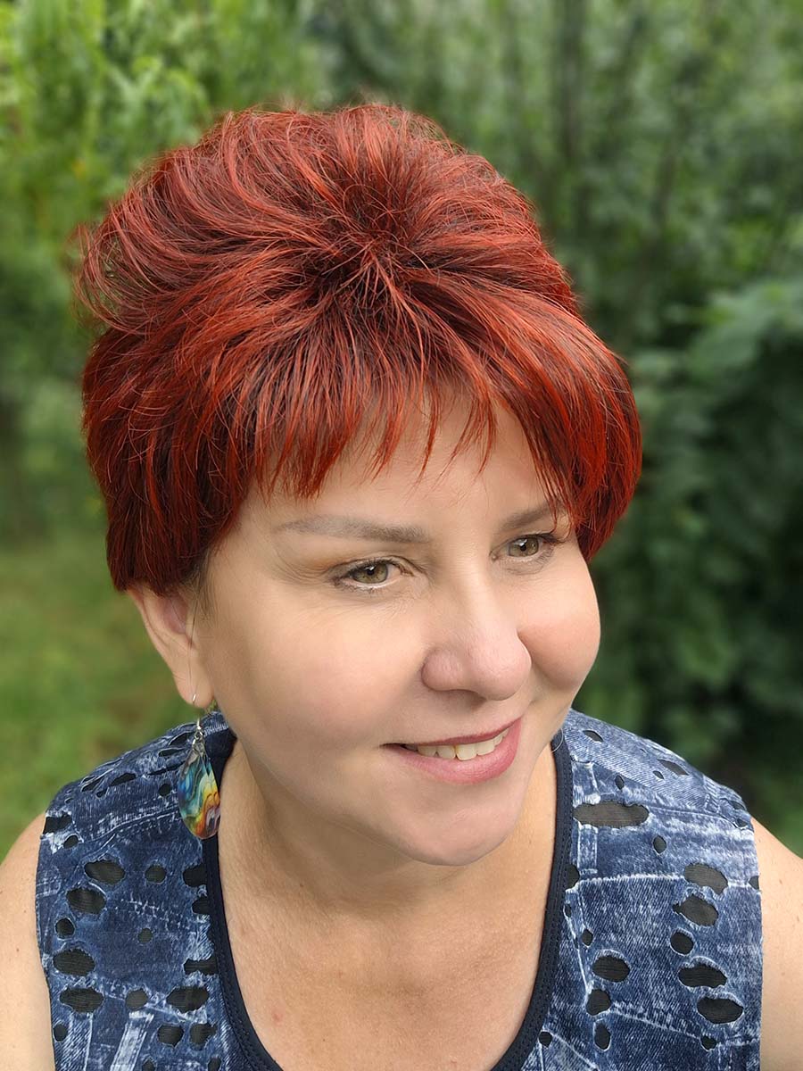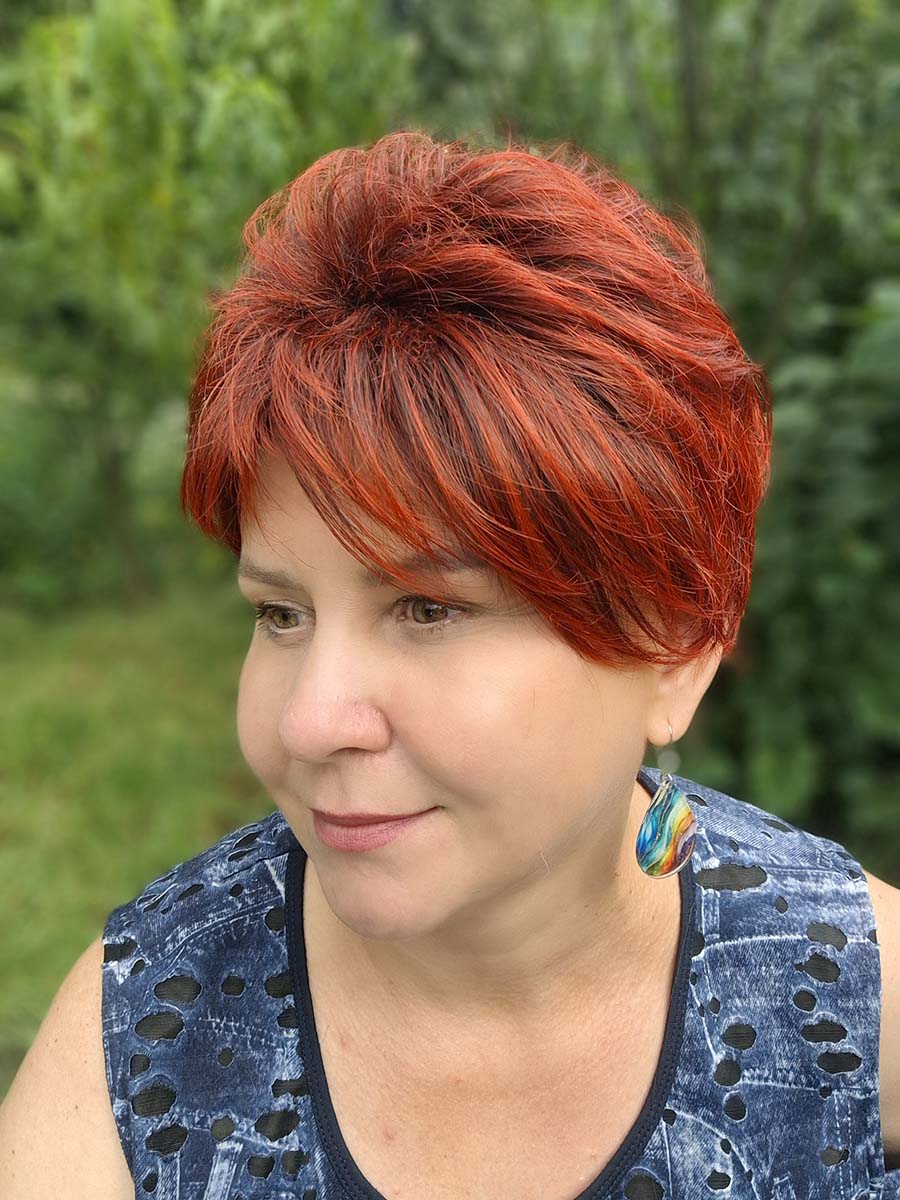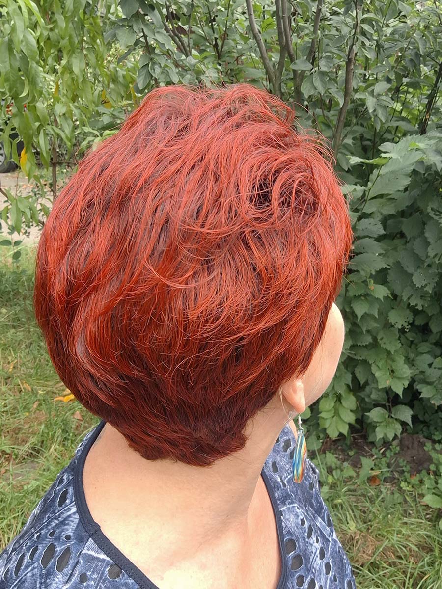 Fryzura krótka, pocieniowana, o wyraźnie asymetrycznej grzywce. Tył króciutki, przylegający do głowy.