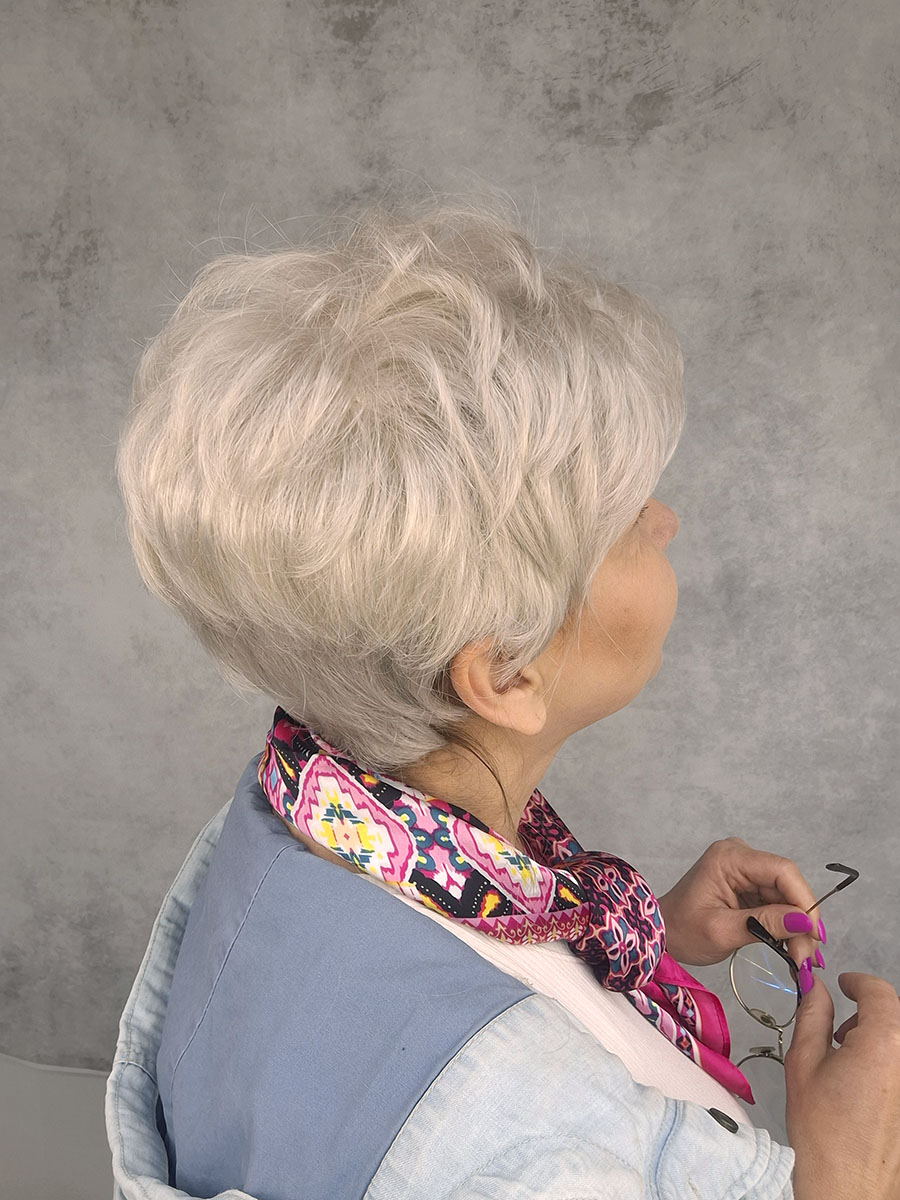Włosy są krótkie na grzywce, zaczesane na prawą stronę, bez wyraźnego przedziałka. Boki przy twarzy są płasko i krótko przystrzyżone. Tył również krótki, gładko leżący.