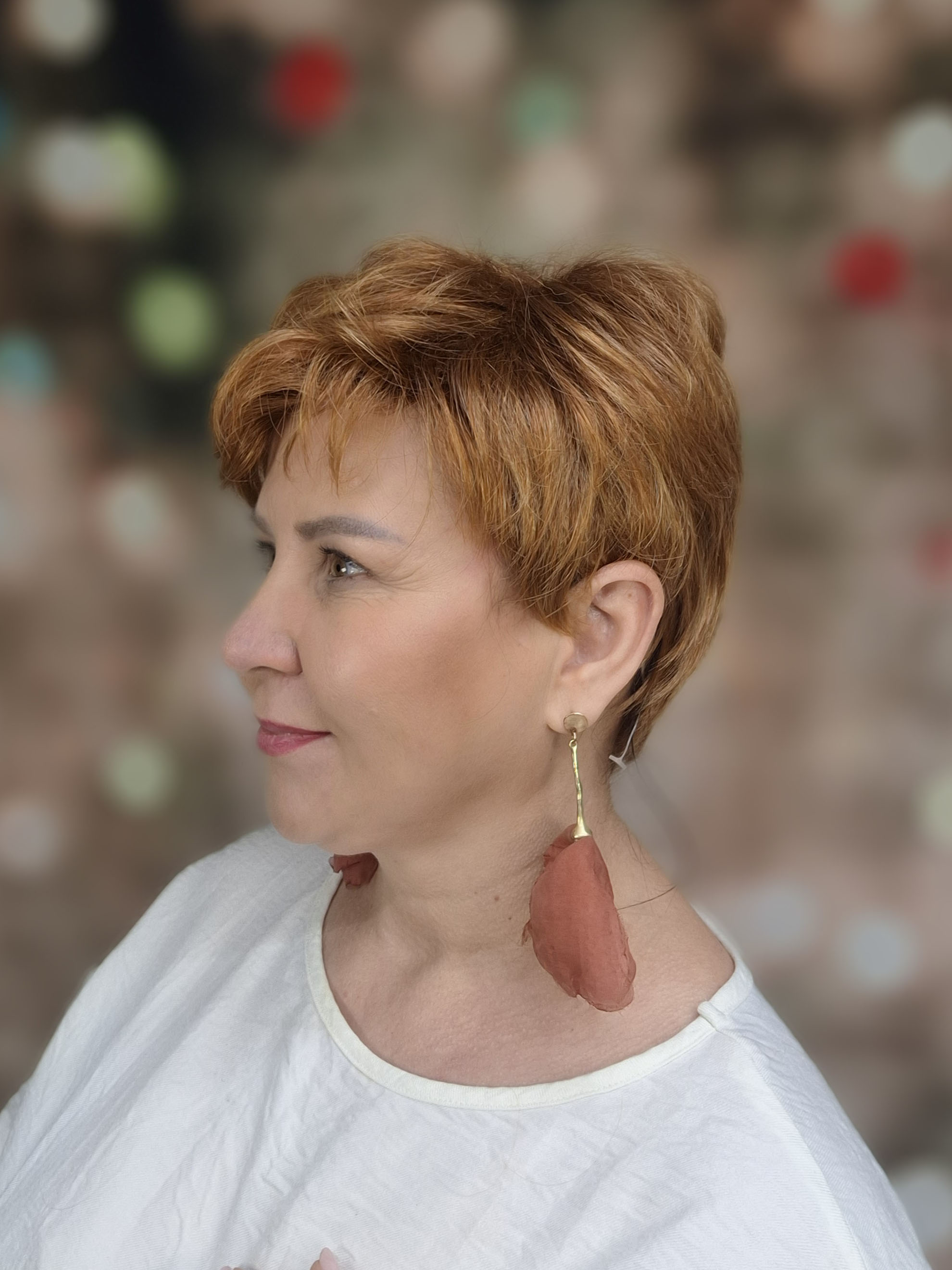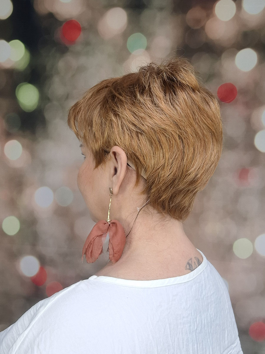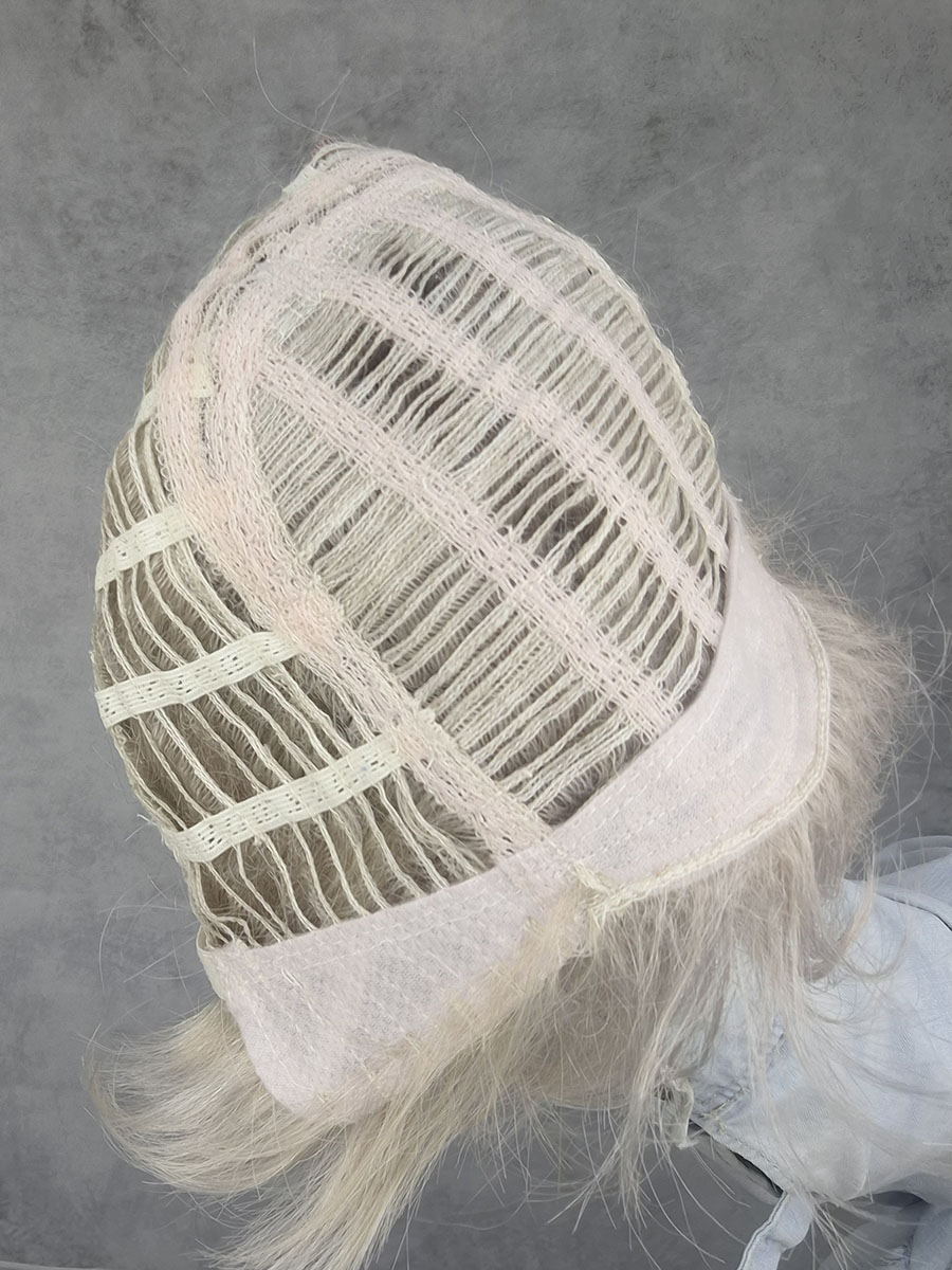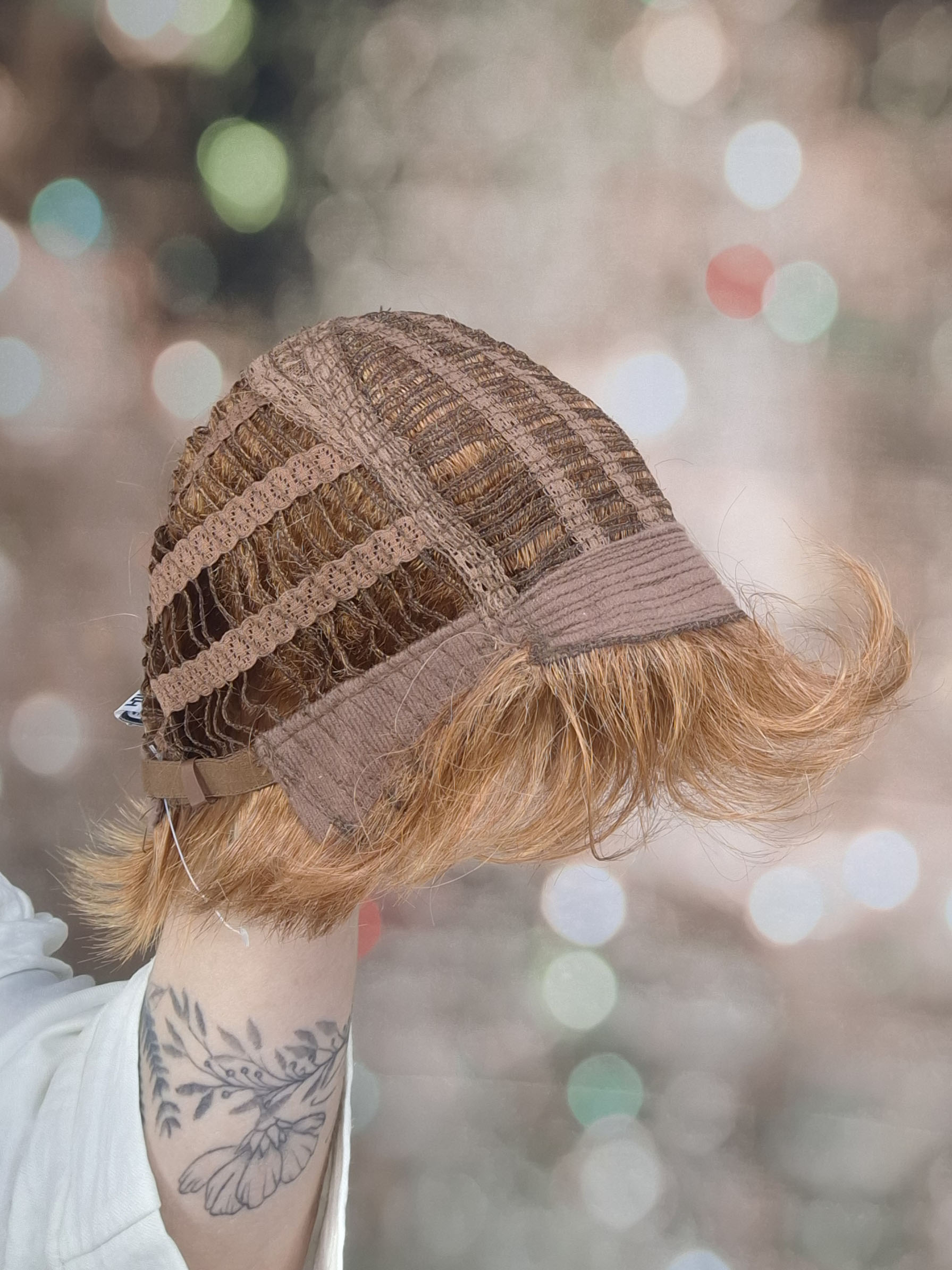 Lekka peruka z włosów syntetycznych, cienkich i zwiewnych- w dotyku nieco suche.