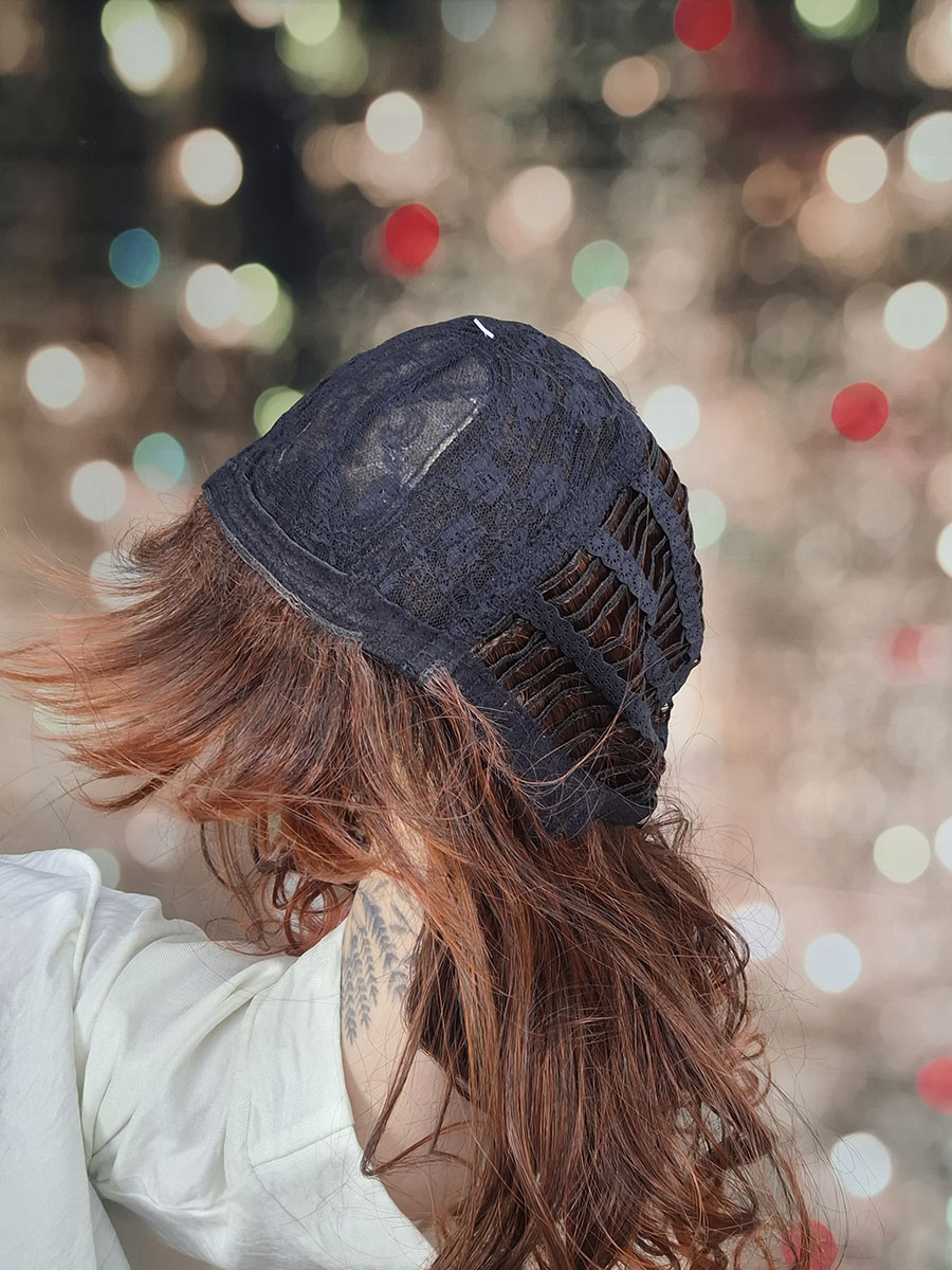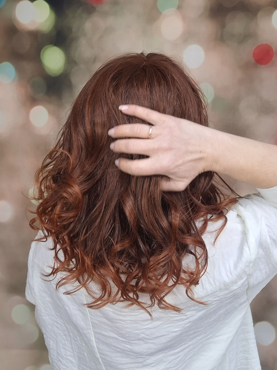 Wdzięczna, półdługa fryzura z subtelnie skręconymi lokami od połowy policzków. Włosy miękkie , delikatne i zwiewne. Grzywka średniej gęstości. Peruka wykonana jest z syntetycznych włosów, ale o bardzo naturalnym wyglądzie – nie jest szklista, nie zdradza żadnych połysków, nawet w ostrym świetle. Posiada krótki 3-centymetrowy przedziałek ze wstawką lateksową.