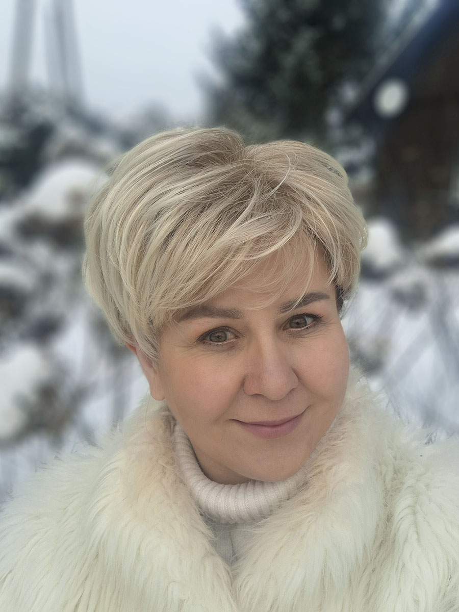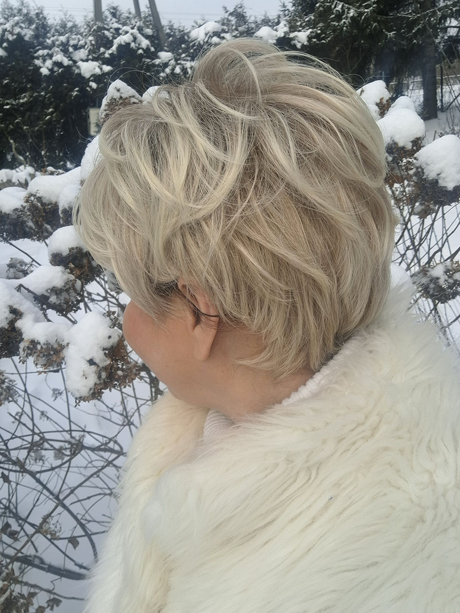 Krótka, ładnie obcięta fryzura o lekko puszystej formie. Włosy są krótkie, gęste, podniesione u nasady i delikatnie podwinięte.