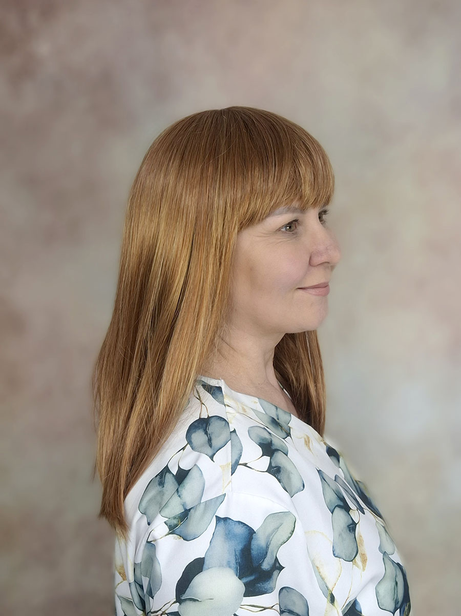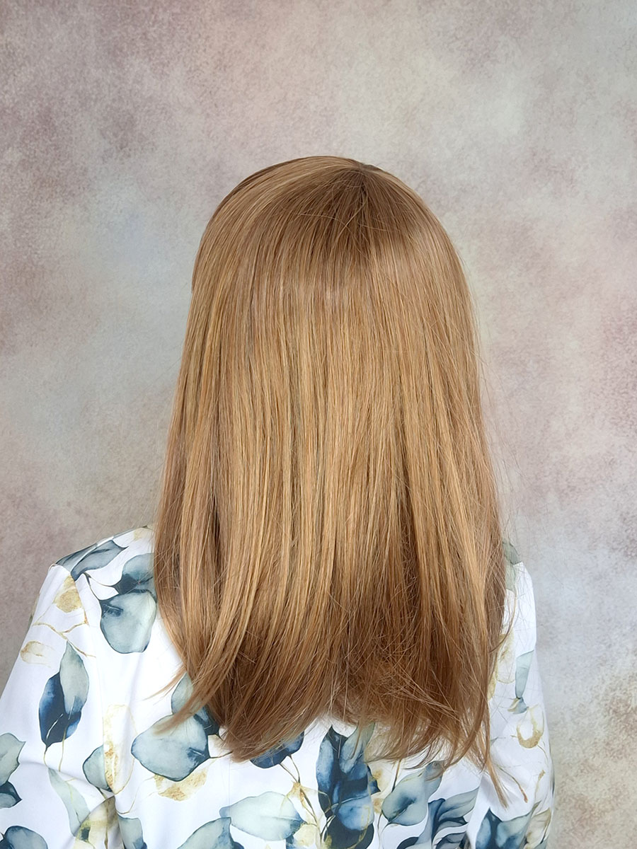Peruka wykonana z wysokiej jakości włosów – kanekalonu, które do złudzenia przypominają naturalne włosy – sa miękkie, lekkie i bardzo przyjemne w dotyku. Fason typu long bob (lob) o długości około 48 cm pięknie układa się na ramionach, tworząc ponadczasową, kobiecą formę, która pasuje zarówno do codziennych stylizacji, jak i bardziej eleganckich okazji. Wyraźna grzywka podkreśla rysy twarzy i dodaje fryzurze wyrazistej formy.