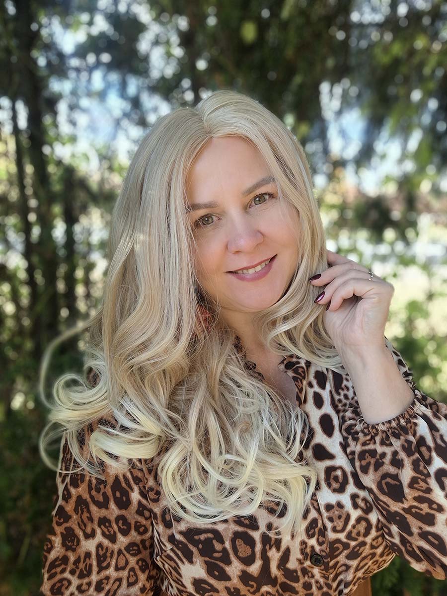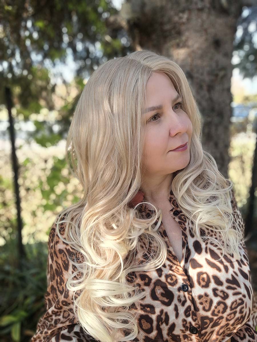 Peruka nie posiada grzywki, ma ręcznie tkany przedziałek na środku głowy, przez co peruka wygląda bardzo naturalnie.
