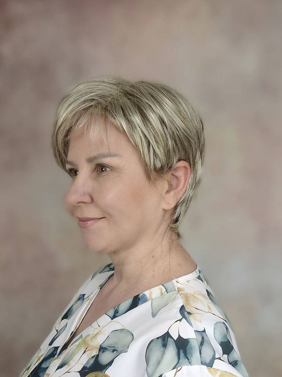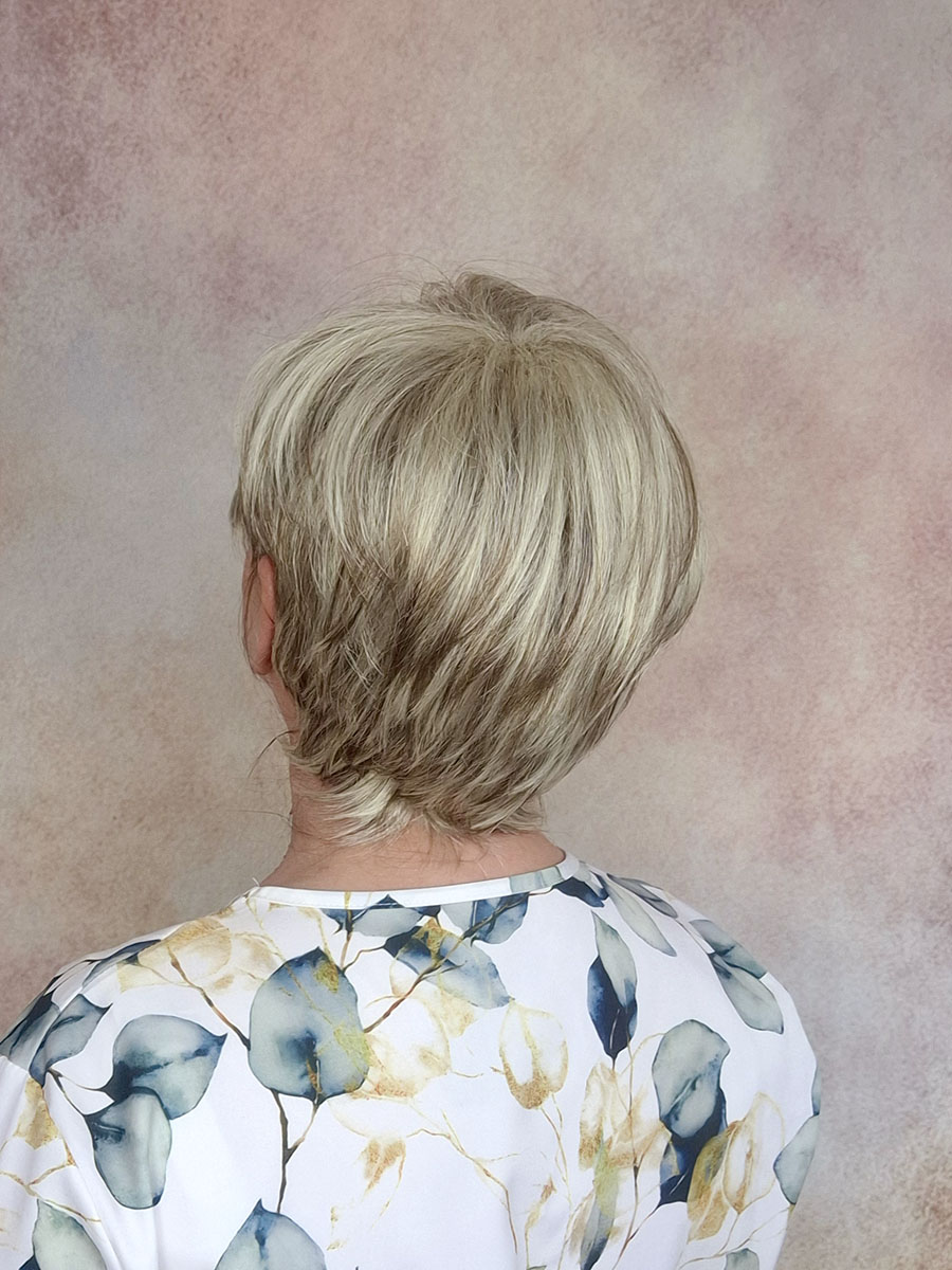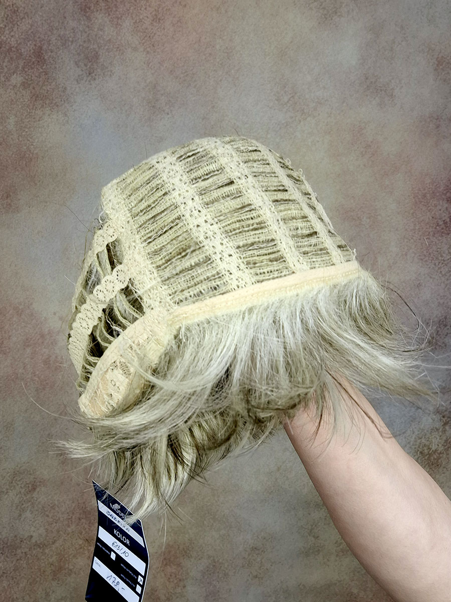 Krótka, klasycznie obcięta peruka damska wykonana z lekkich i delikatnych włosów.