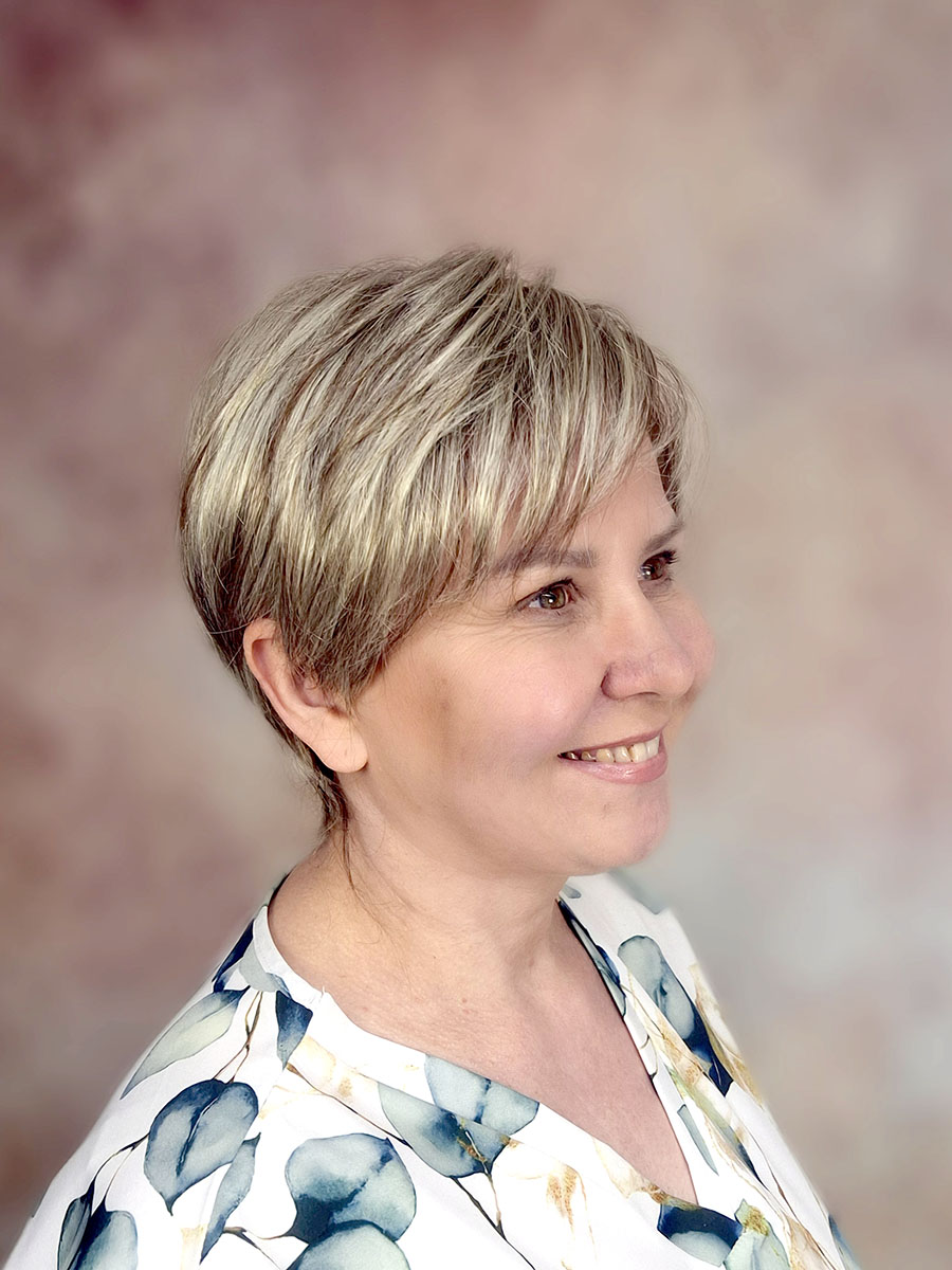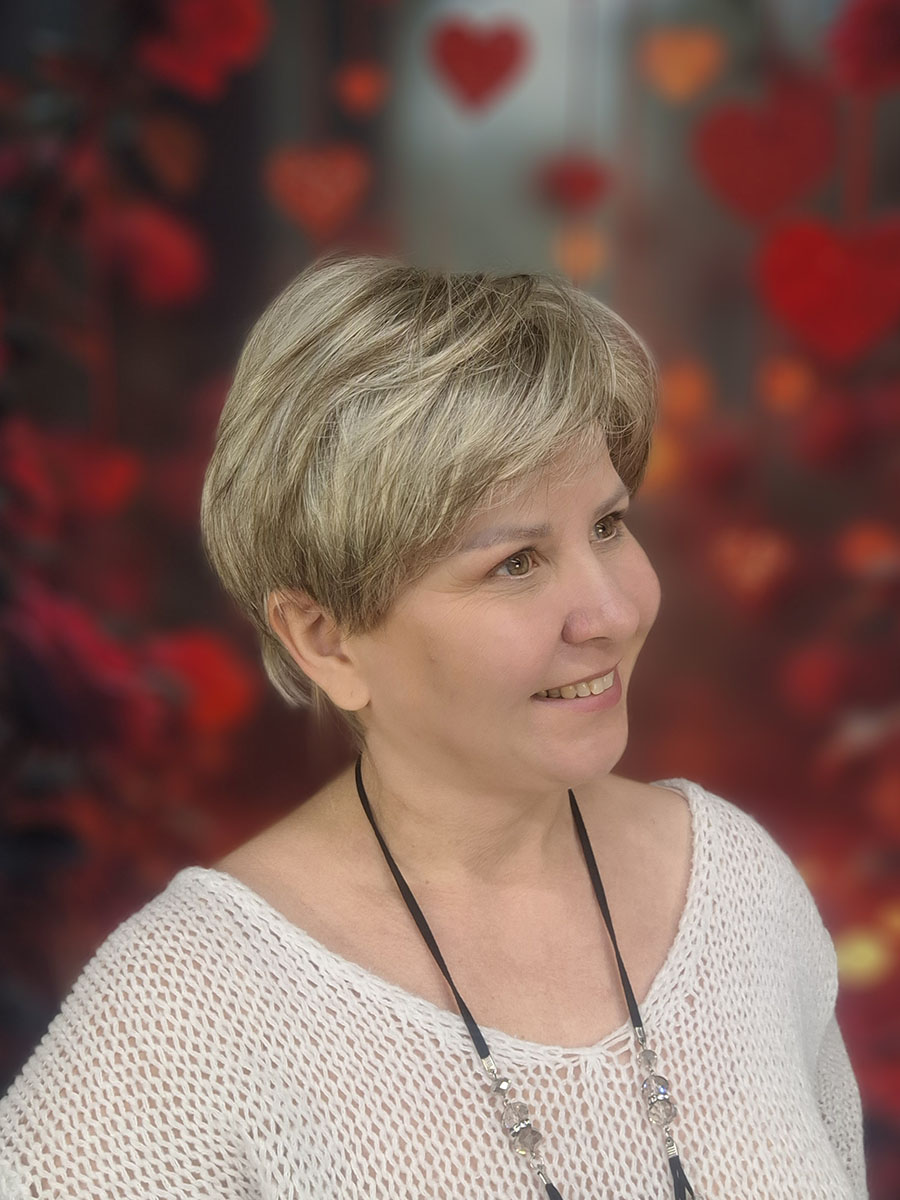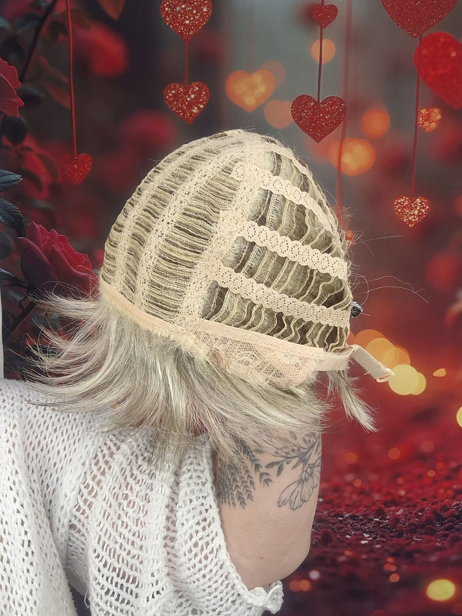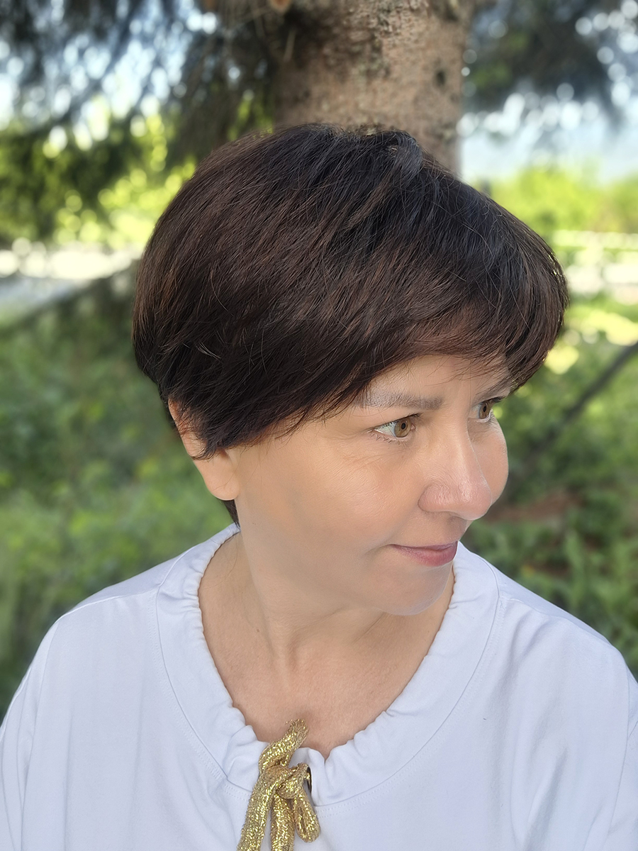 Krótka, klasycznie obcięta peruka damska wykonana z lekkich i delikatnych włosów.
