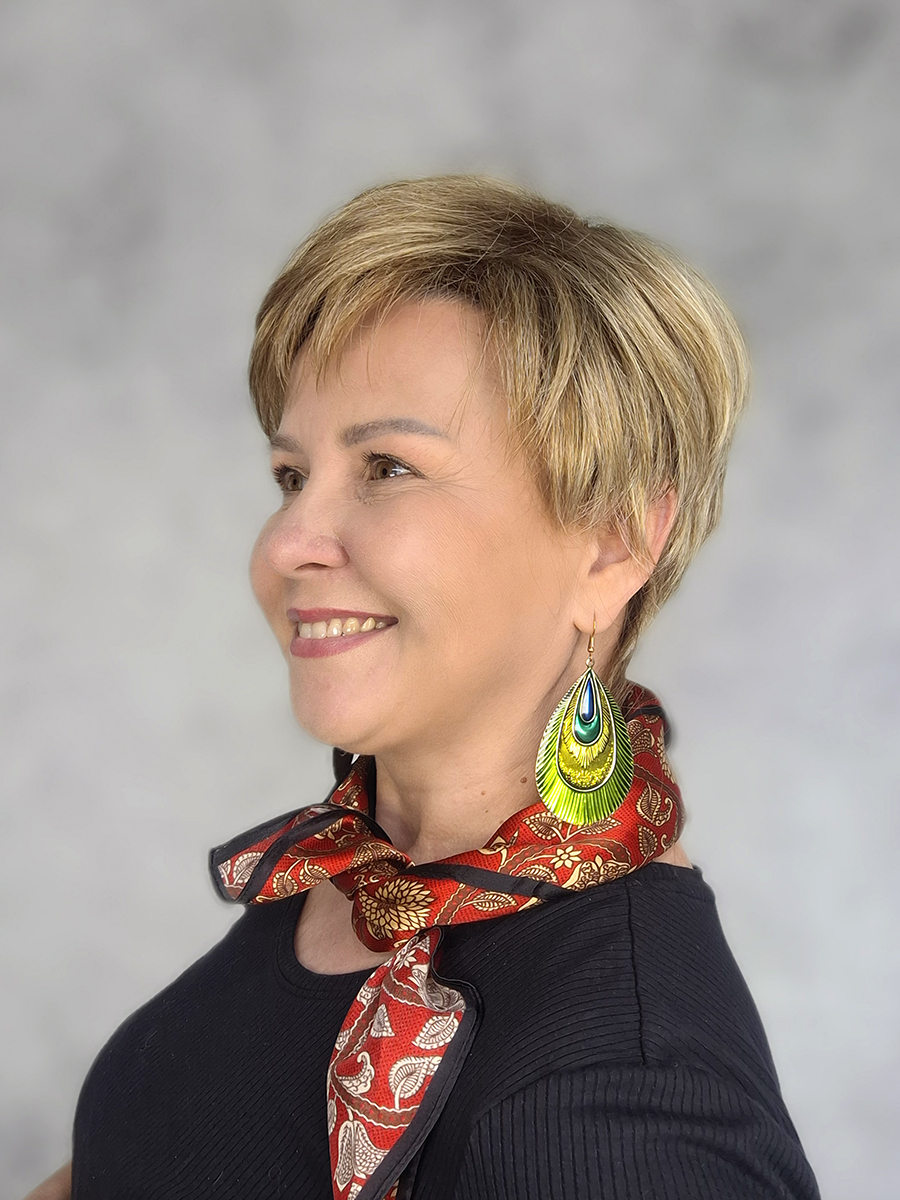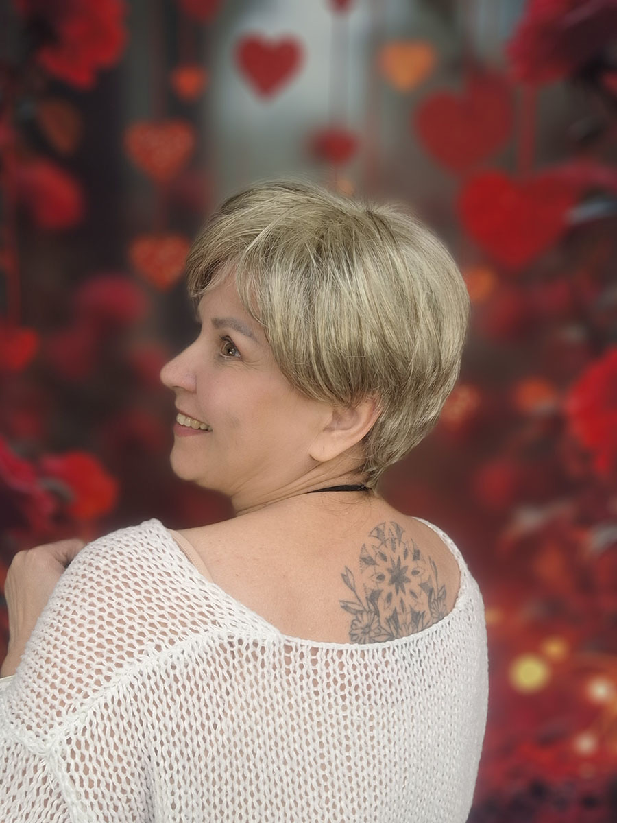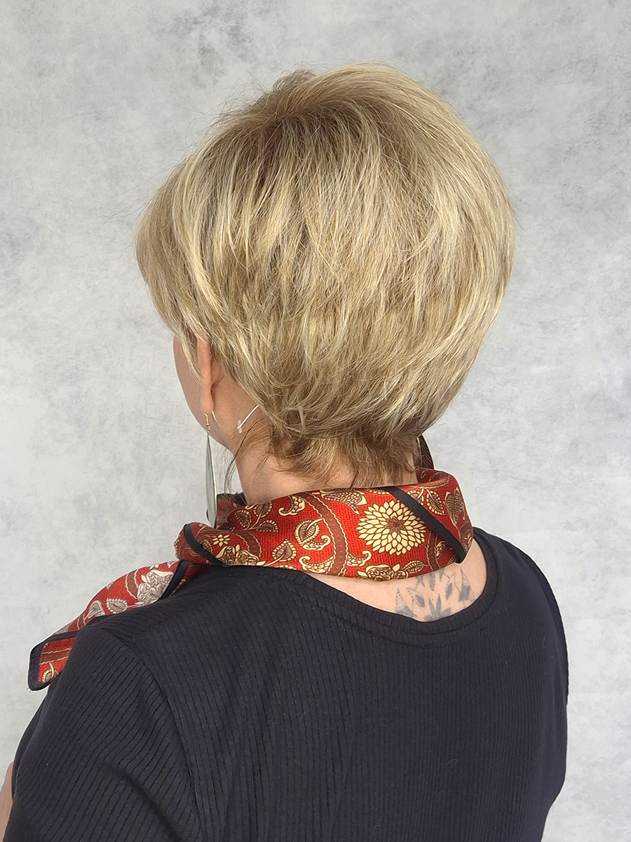 Grzywka o naturalnej gęstości, do zaczesania na prawy bok, uszy odkryte, tył krótko przystrzyżony, pocieniowany.