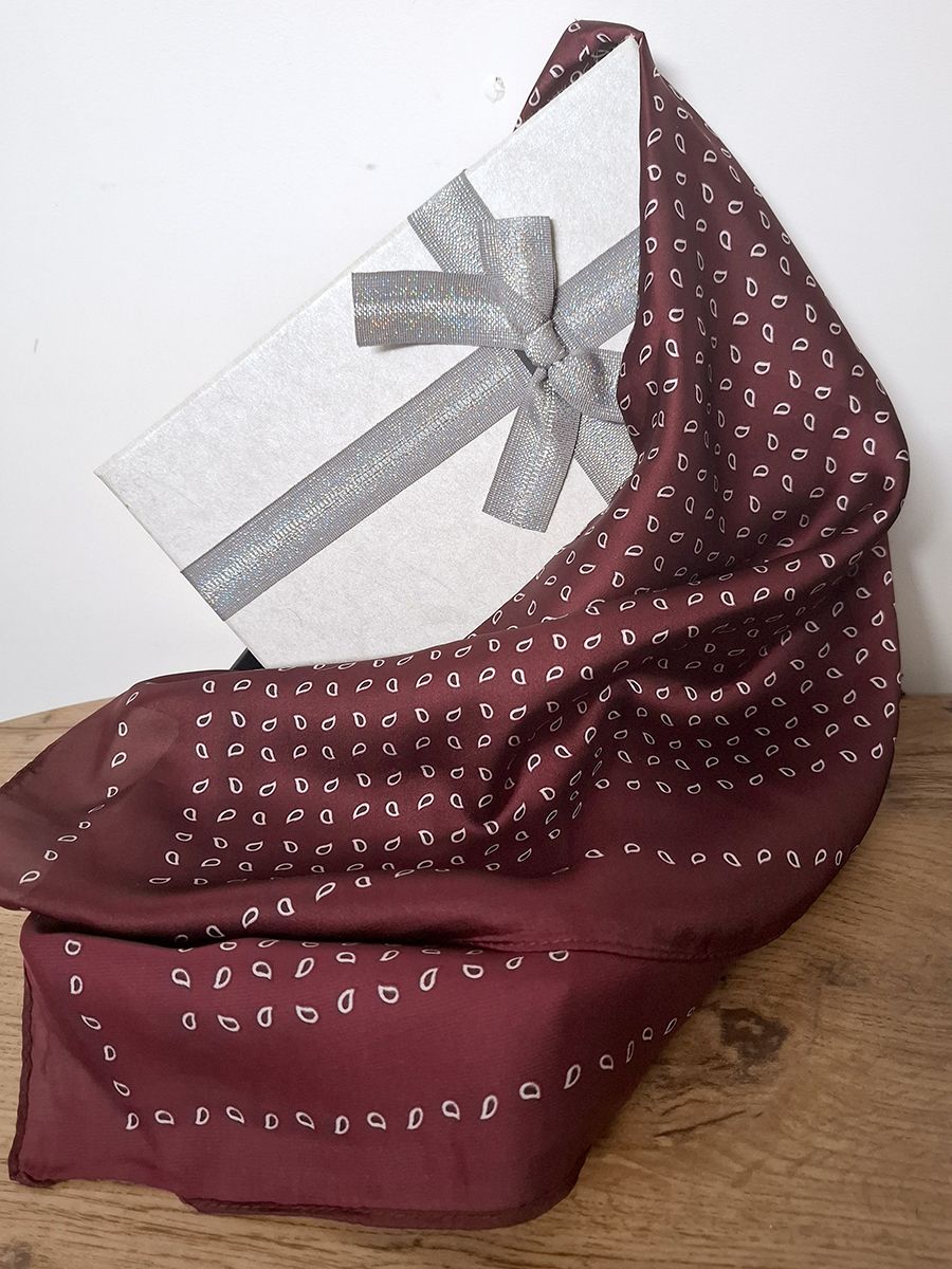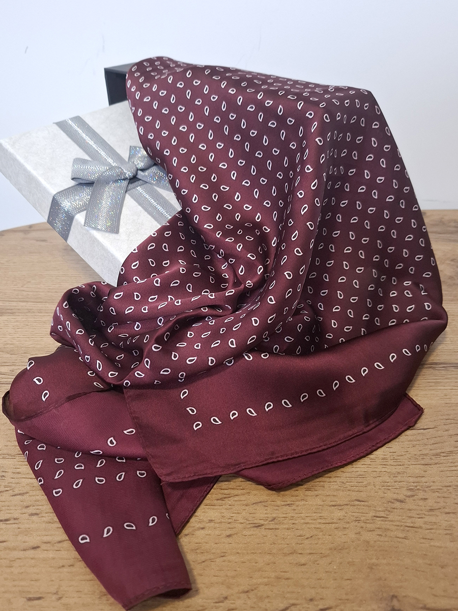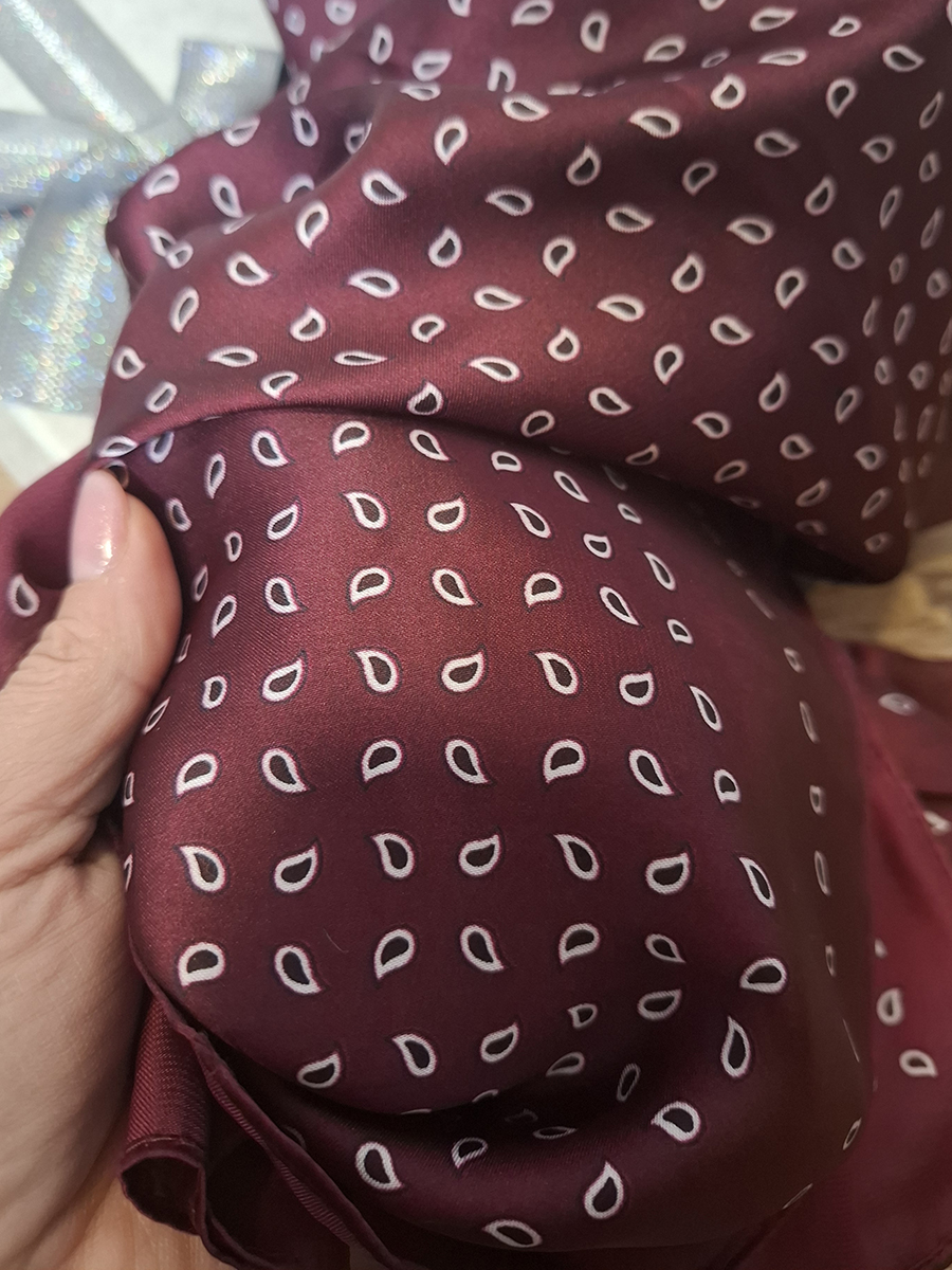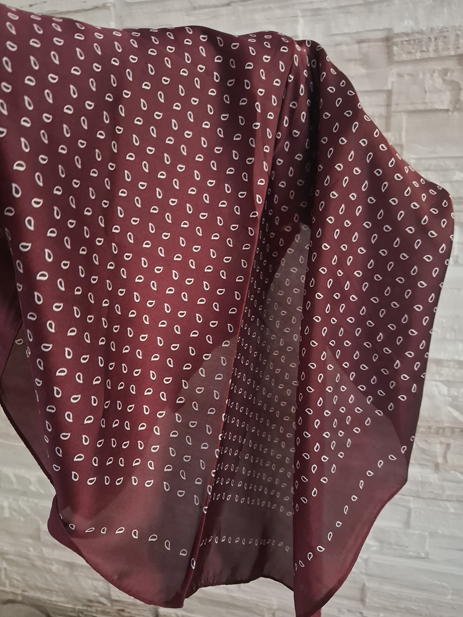 Delikatna i lekka apaszka wykonana z satyny przypominającej jedwab, o gładkiej, lejącej powierzchni i subtelnym połysku. Materiał, dzięki charakterystycznemu splotowi atłasowemu, jest miękki, przyjemny w dotyku i lekki, co zapewnia komfort nawet przy wrażliwej skórze. Apaszka może pełnić funkcję subtelnego dodatku do włosów, eleganckiego okrycia głowy lub klasycznej apaszki do stylizacji.
