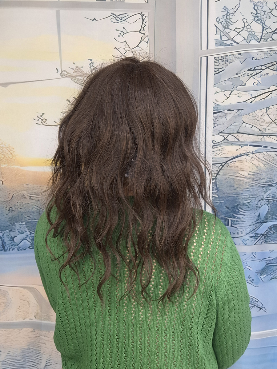 Długość włosów sięga do łopatki i ma ok. 40 cm. – jest fryzurą o lekko falowanych włosach z delikatnym akcentem podwiniętych końcówek, które dodają subtelnej objętości. Włosy topperu można razem z własnymi włosami upinać i związywać w różne fryzury.