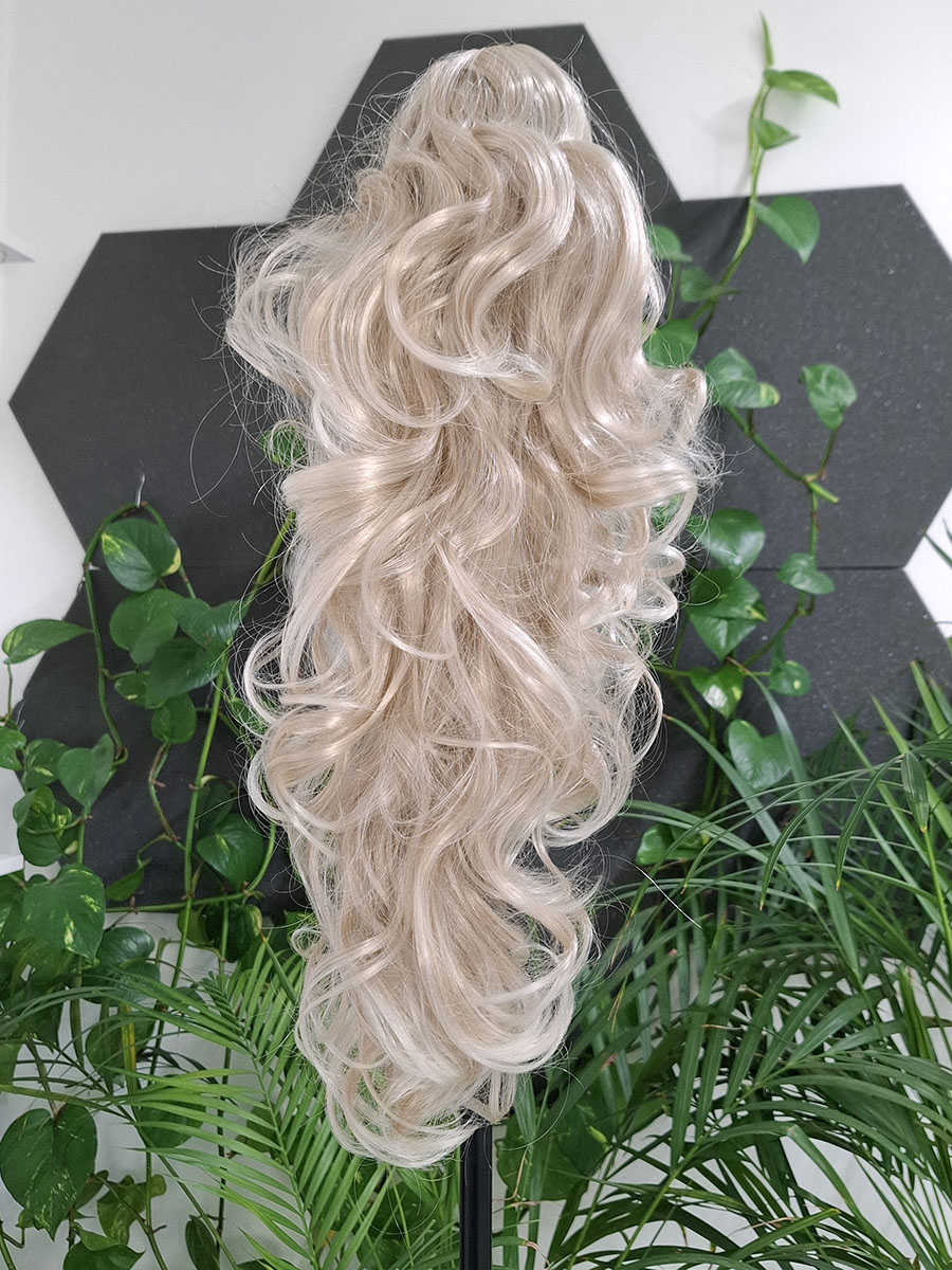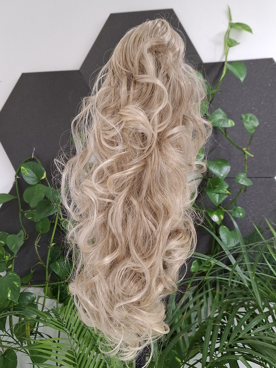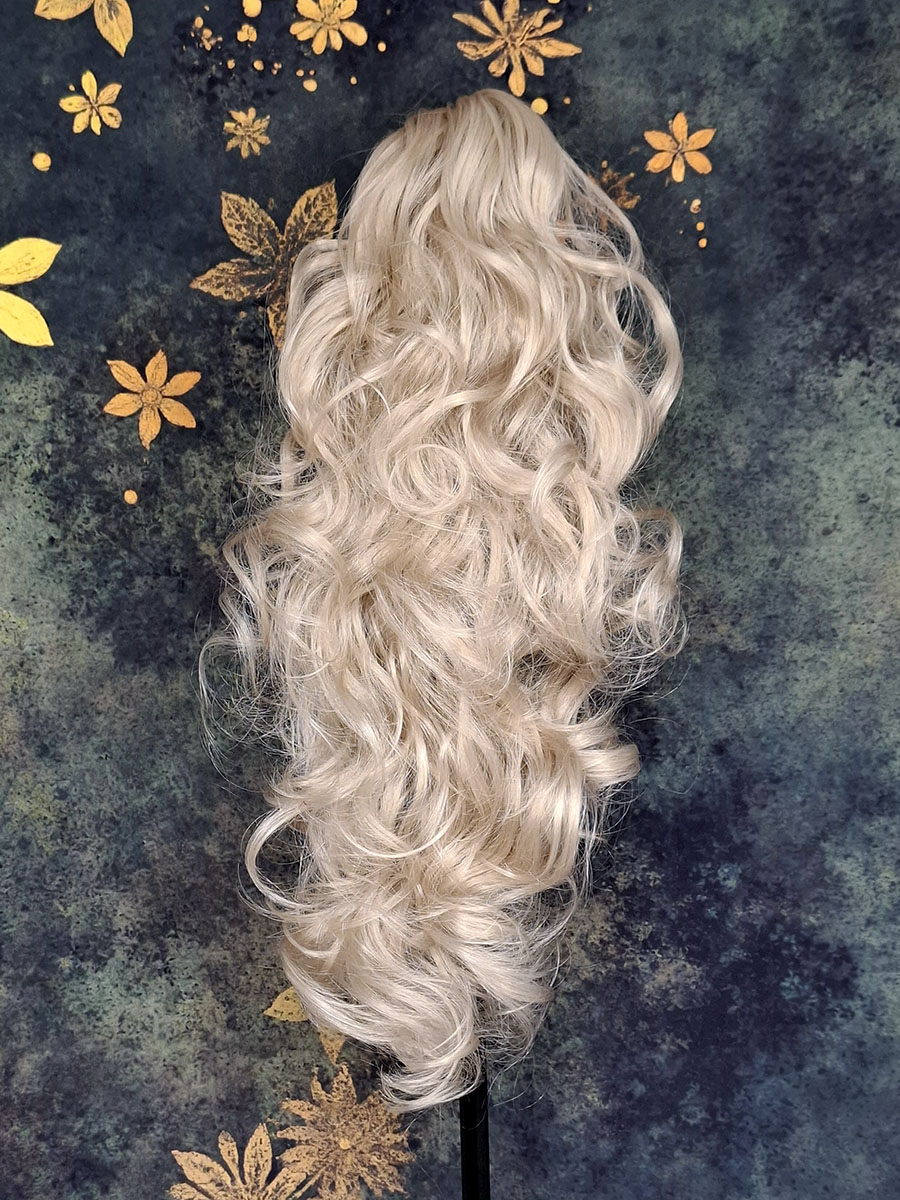 Treska syntetyczna z lokami średniej grubości. Skręt włosów od samej góry, schodzi w dół w sposób lekki wystopniowany.