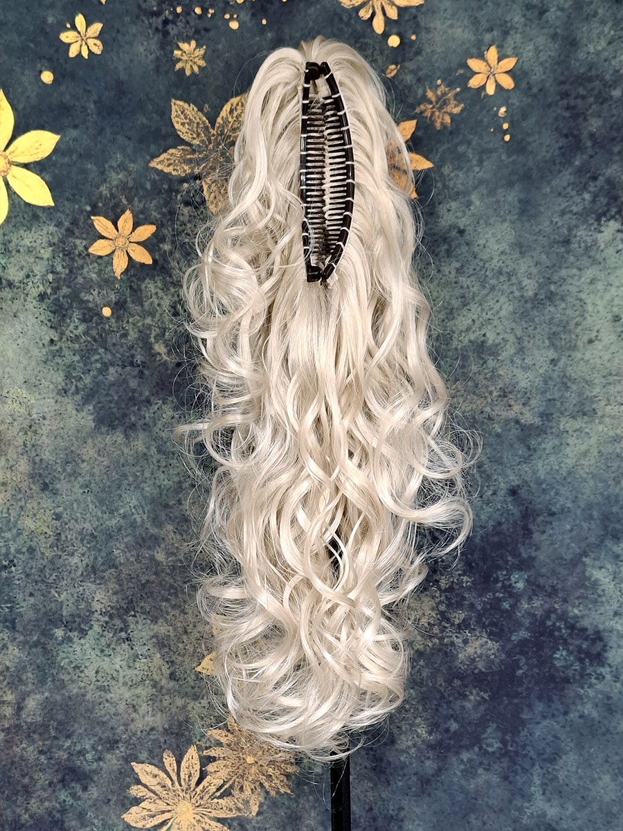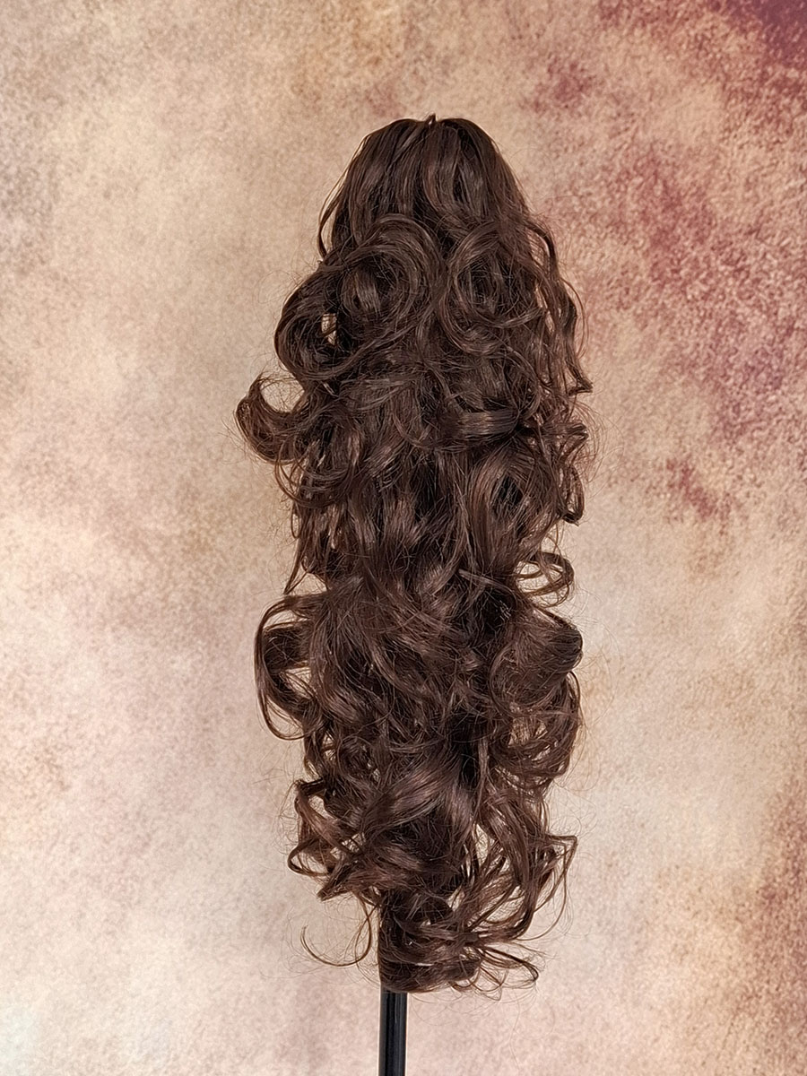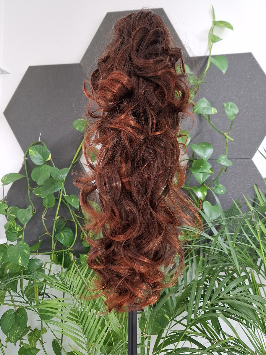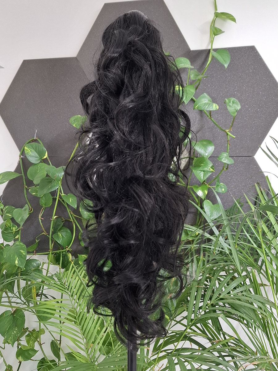 Treska syntetyczna z lokami średniej grubości. Skręt włosów od samej góry, schodzi w dół w sposób lekki wystopniowany.